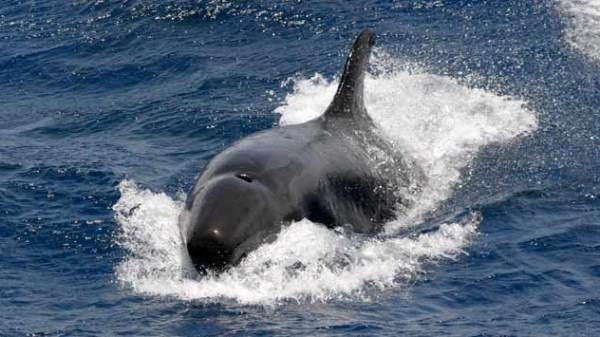 False killer whales put on a show—they’re fast, active swimmers and individuals will often breach clear out of the water and land on their side with a dramatic splash. Other times, they’ll do a “spy hop”, emerging from the water with just their head held high upwards and their mouth open, revealing some of their 44 teeth.