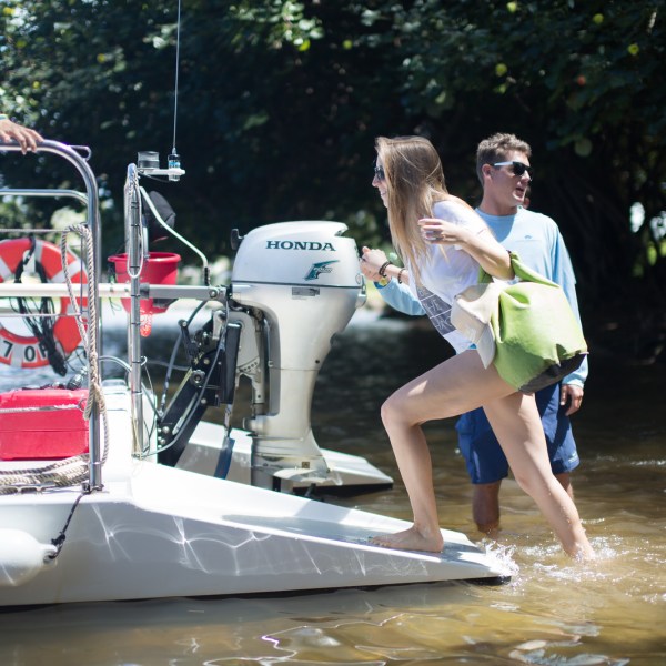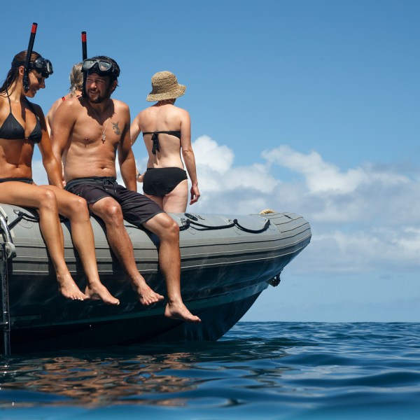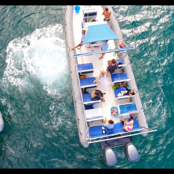 Just a step away from water entry, a ladder is provided for ease of access back onto the vessel and a freshwater shower is available when snorkeling is done. Featuring a small but functional marine head (restroom) on board, and a retractable canopy for shade when stopped but great unobstructed views while in motion.