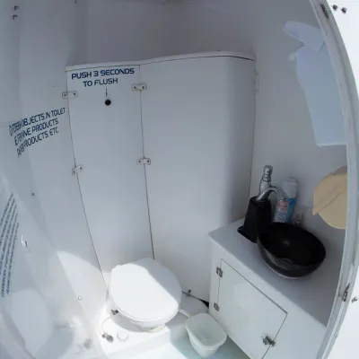 The cabin area features a bar and seating at two large tables, plus additional bench seating to keep you out of the elements, as well as space to store your belongings. Two heads (restrooms) are located on deck for your convenience (no need to climb or descend a ladder to use the facilities).